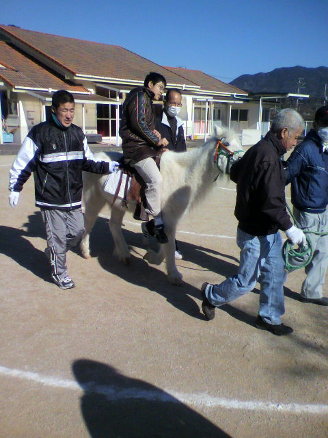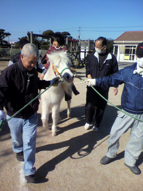 を厩舎のある東光さん宅まで行き、幼稚園まで約1.5キロの道のりをポニーを引いて歩いて行きました。体験乗馬では、初めての子どもは最初少し緊張していましたが、慣れてくると笑顔で両手を離したうまくバランスをとっていました。