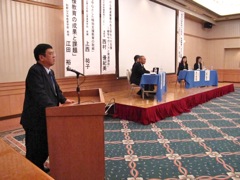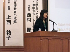 NHK厚生文化事業団大野近畿支局長のあいさつの後、「特別支援教育の今 ~特別支援教育の成果と課題~」を開催テーマとし、北海道大学大学院教授の田中康雄先生を迎えて基調講演テーマ「特別支援教育が自閉症・発達障害へ与えた影響と課題」でお話しいただき、その後、富山大学保健管理センター准教授の西村優紀美先生から「大学における発達障害のある学生への支援 ~修学サポートと発達援助」、和歌山東高校の上西祐子先生から「発達障害を中心とした特別支援教育の取り組み」と題して実践発表をしていただきました。