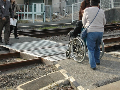 私は、A班に参加して、道路の凸凹の傷み・段差・危険箇所や電動車いすや歩行者が通行できるスペース、カーブミラー設置の状況、駅周辺ではバス停の状況、障害者用自動車駐車スペース、同トイレの設置状況・スペース、駅舎内の待合室や券売機の高さや点字の有無、駅ホームのトイレの状況、待合室等の進入経路、防護策の有無、段差、ベンチの有無、緊急を知らせる掲示板の設置の有無、聴覚障害者のための電光掲示板設置の有無、手すり等を調査し、以前調査実施した箇所の改善がされているかどうかの確認も行った。