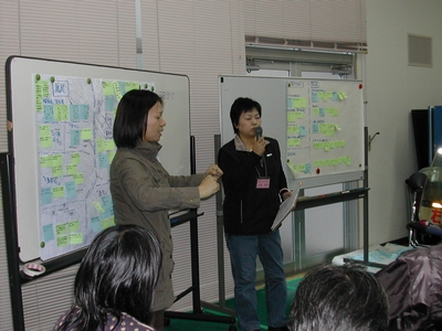 現地調査後、再び市民総合センターで調査結果を各班ごとにまとめ、調査で確認できた危険箇所や改善を必要とする場所などを発表して、今後のバリアフリー基本構想協議会で資料として反映させることにした。