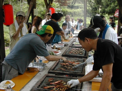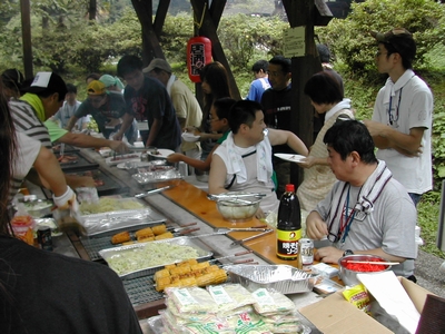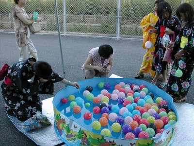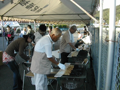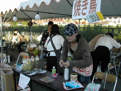 、カキ氷、たこ焼き、ジュース、お菓子、野菜、日用品とバザー模擬店が開かれ、私は焼き鳥のお手伝いをさせてもらいました。 焼き鳥は炭火焼きで250本を焼き、6時の開店から1時間足らずで完売。 カレー、たこ焼き、焼そばと食べ物はすべて完売と盛況でした。