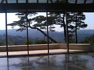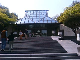 渋い銀白色のトンネルを潜り抜けると橋が掛かっていて、その向こうに山中に顔をのぞかした庵のような感じがする美術館の建物が見えてくる。 設計者はあのルーブルのガラスのピラミッドを設計したI.M.ペイという中国系の設計家であると聞いて、それで桃源郷伝説の雰囲気に納得した。